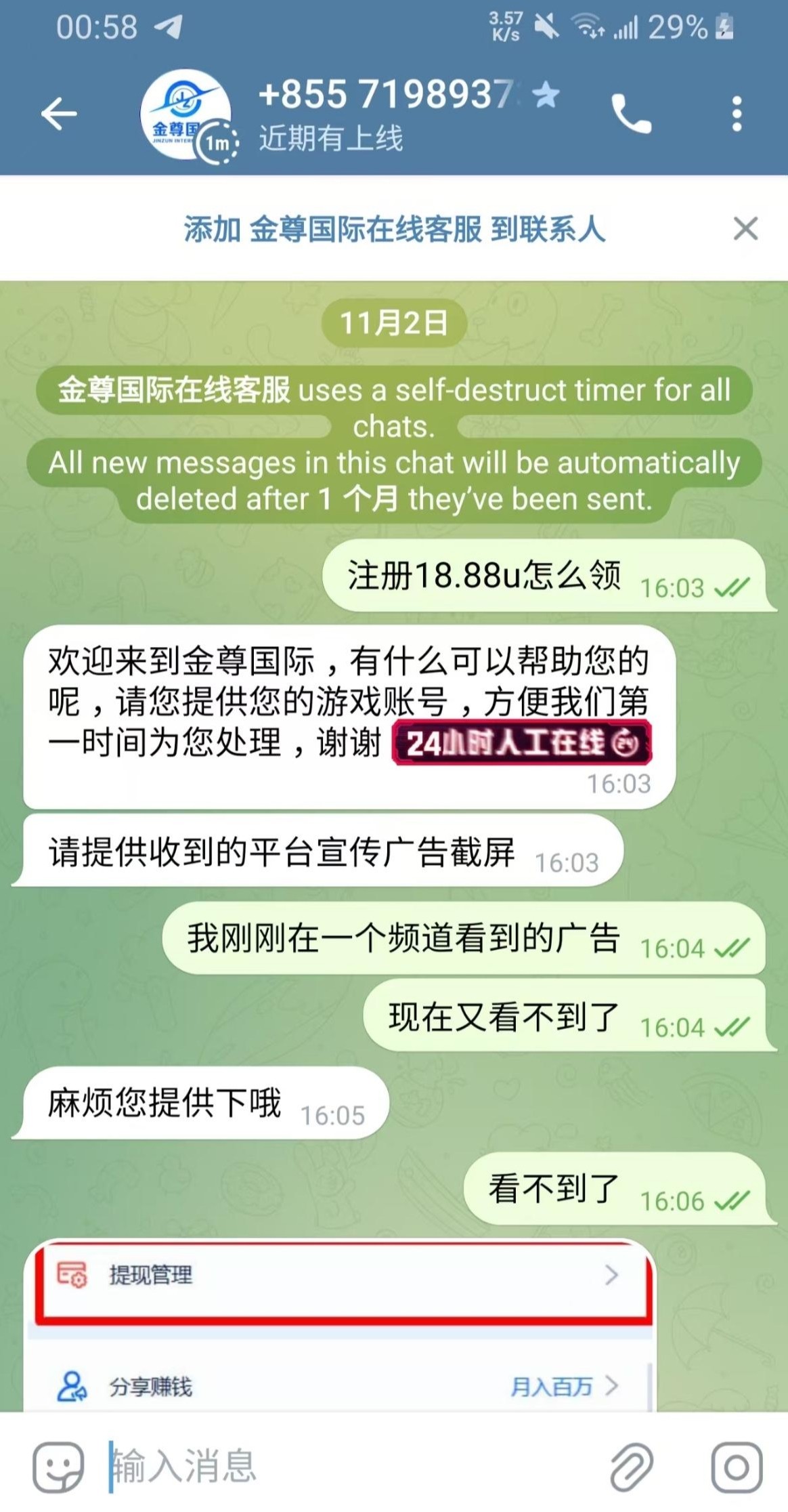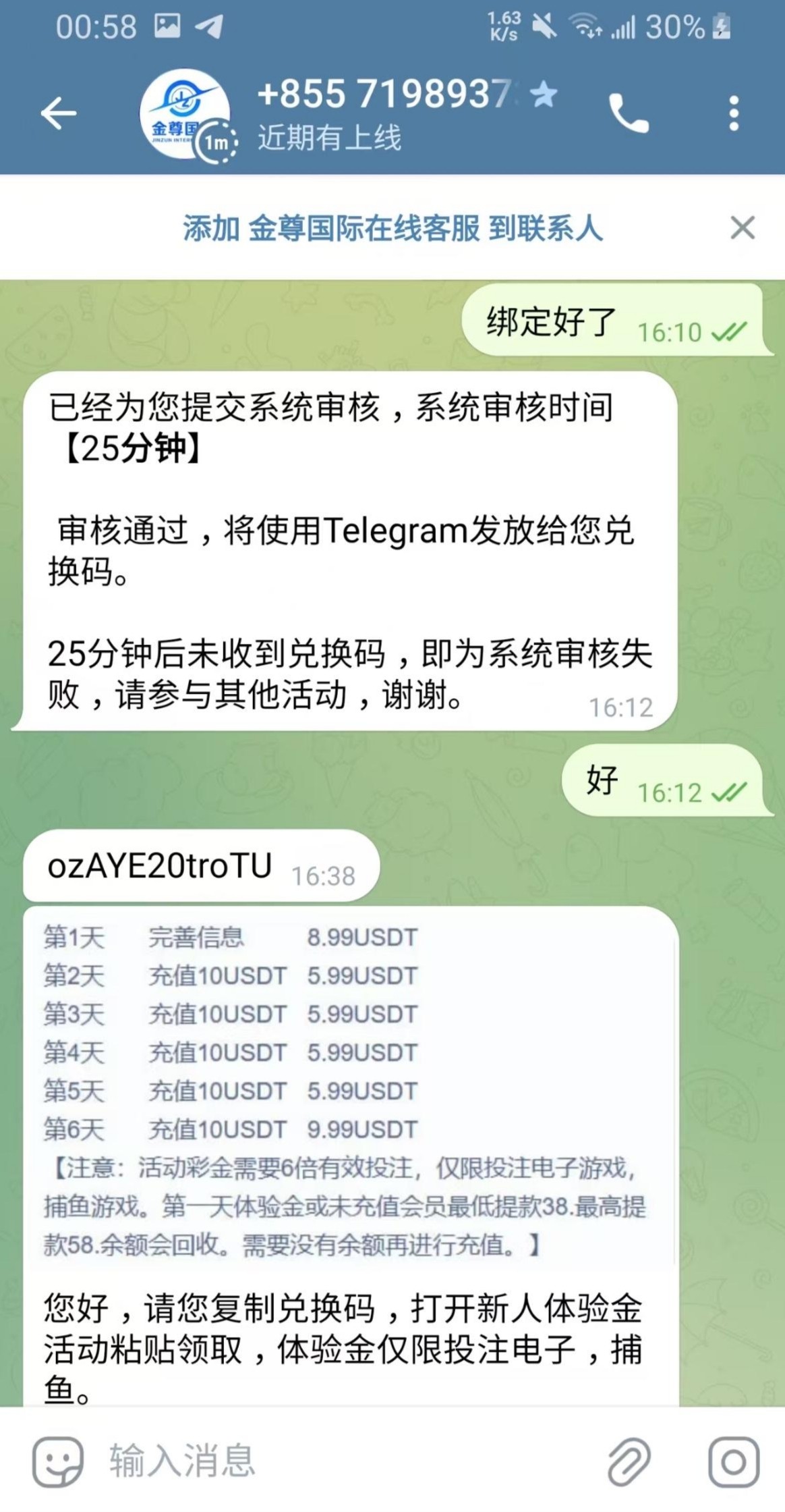 有汇旺的去,绑定手机号和汇旺,汇旺不需要流水。联系飞机客服@JinZunKF 申请。审核通过了会给你一个兑换码。就说在一个频道看到的广告,但是现在看不到了。我领到了没有打出来,请勿充值