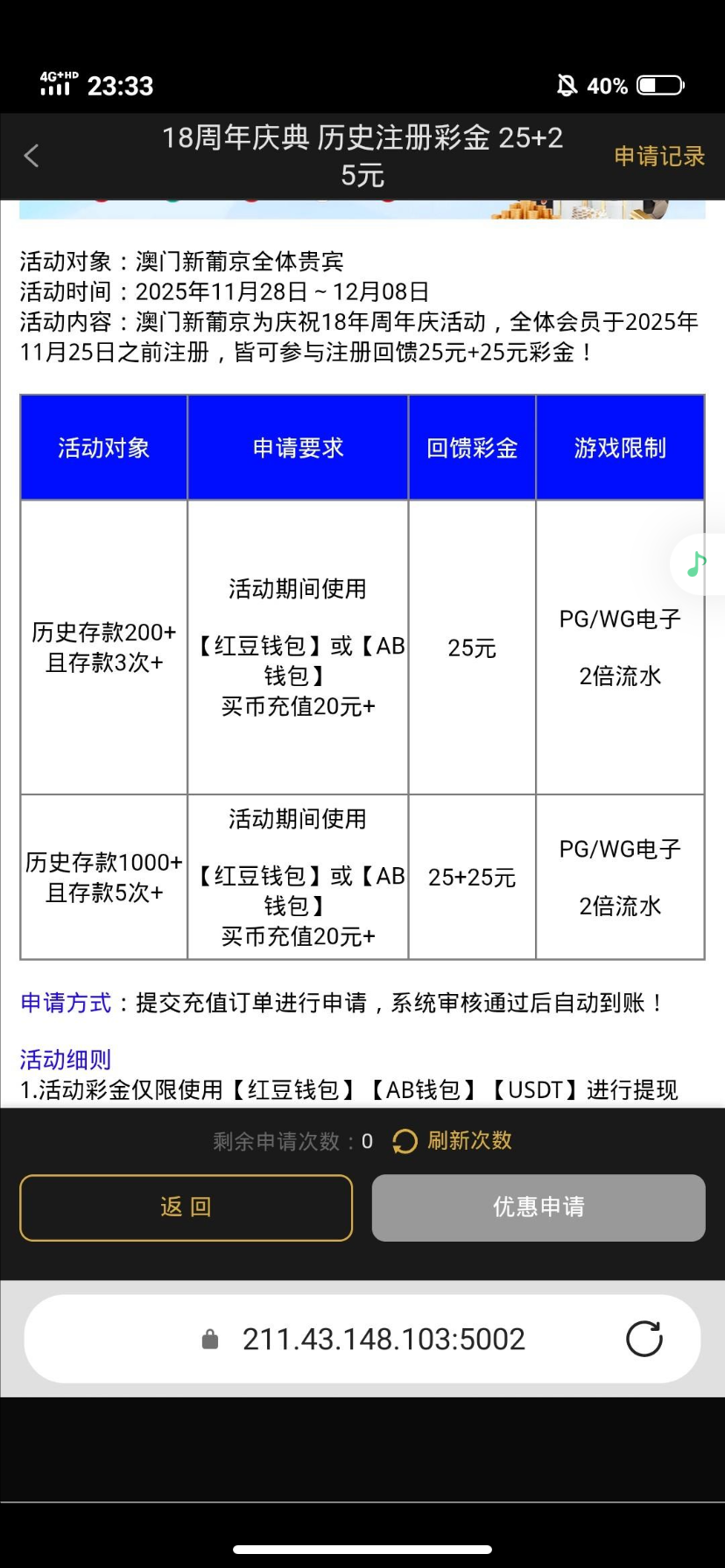 有玩过的去,20+50,还要历史存款彩金,但是要充值申请,格局不是很大 官网 7133.com