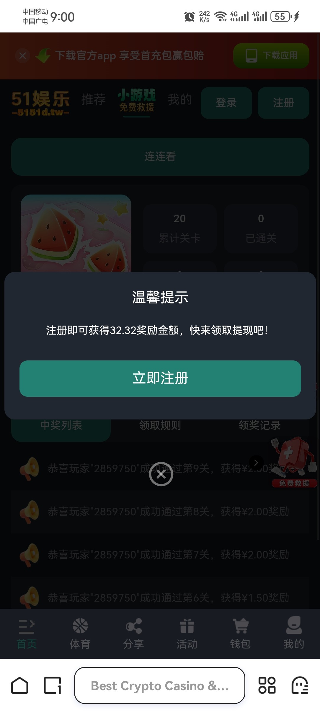 注册就送32,每天签到送2+,小游戏可以赚10几块,50才能进去pg,注册不用手机号,开vpn可以无限撸,我注册十几个,成功打下来一个