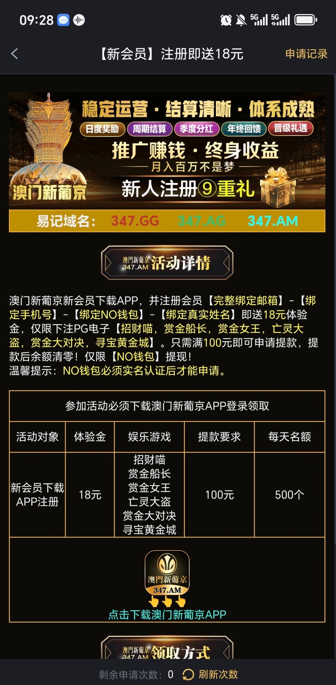 新用户下载app注册送18,要绑定no钱包,钱包要实名,我领导了,没打出来,最多出100链接347.gg