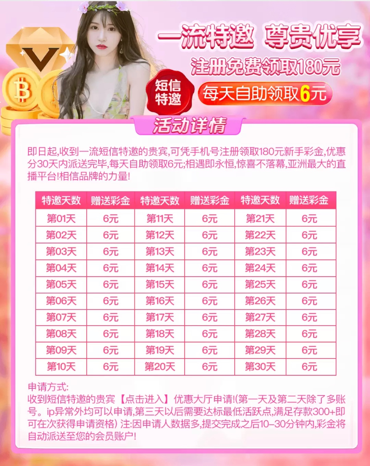 新用户注册绑卡~点下方申请链接/活动办理,自助申请申请特邀彩金送6/100提,只能申请第1和第2期后面要有充值